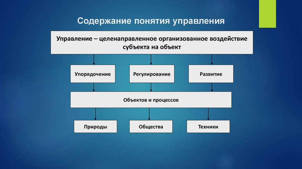 Содержание понятия управленияУправление – целенаправленное организованное воздействие