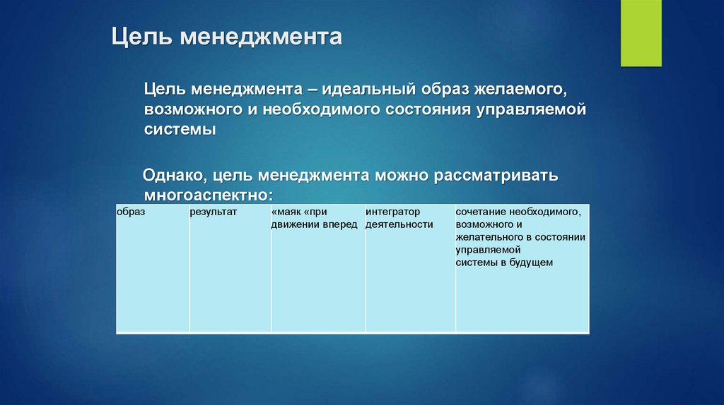 Цель менеджментаЦель менеджмента – идеальный образ желаемого,