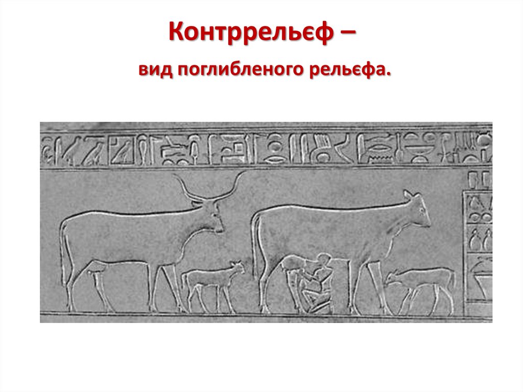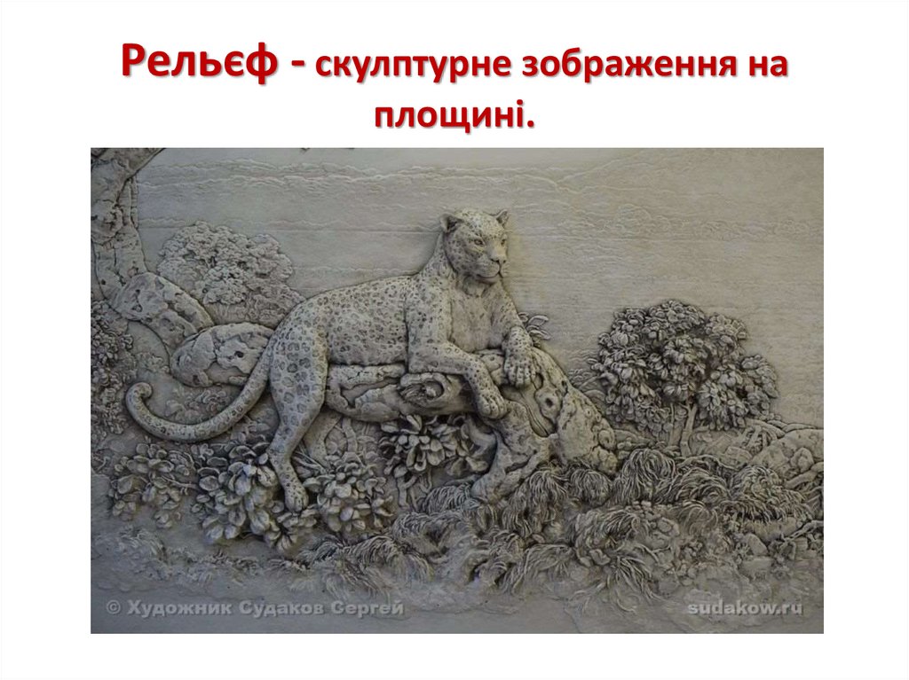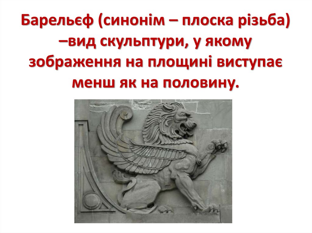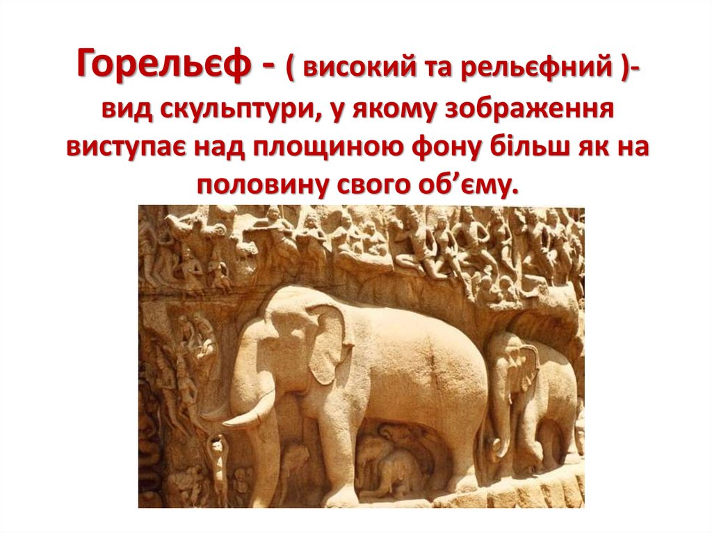 Горельєф - ( високий та рельєфний )вид скульптури, у якому зображеннявиступає над площиною фону більш як на