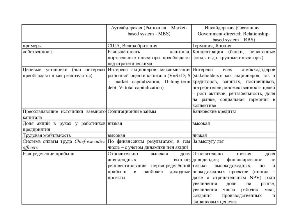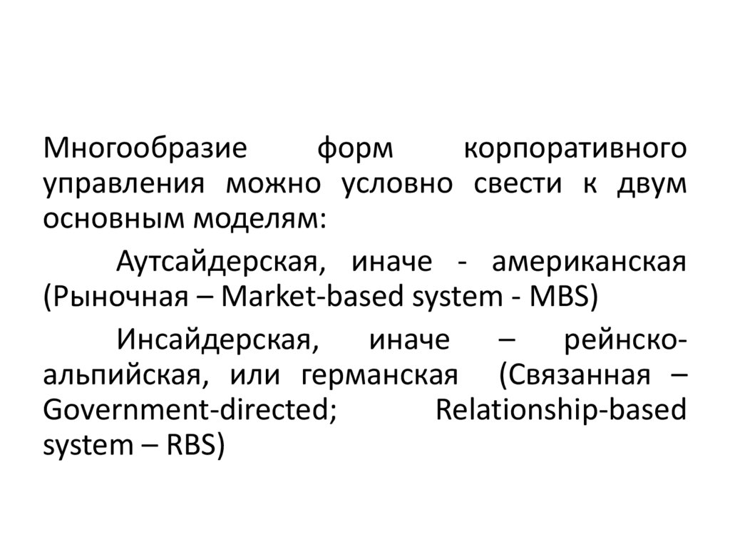 Аутсайдерская (Рыночная – Marketbased system - MBS)Инсайдерская (Связанная –