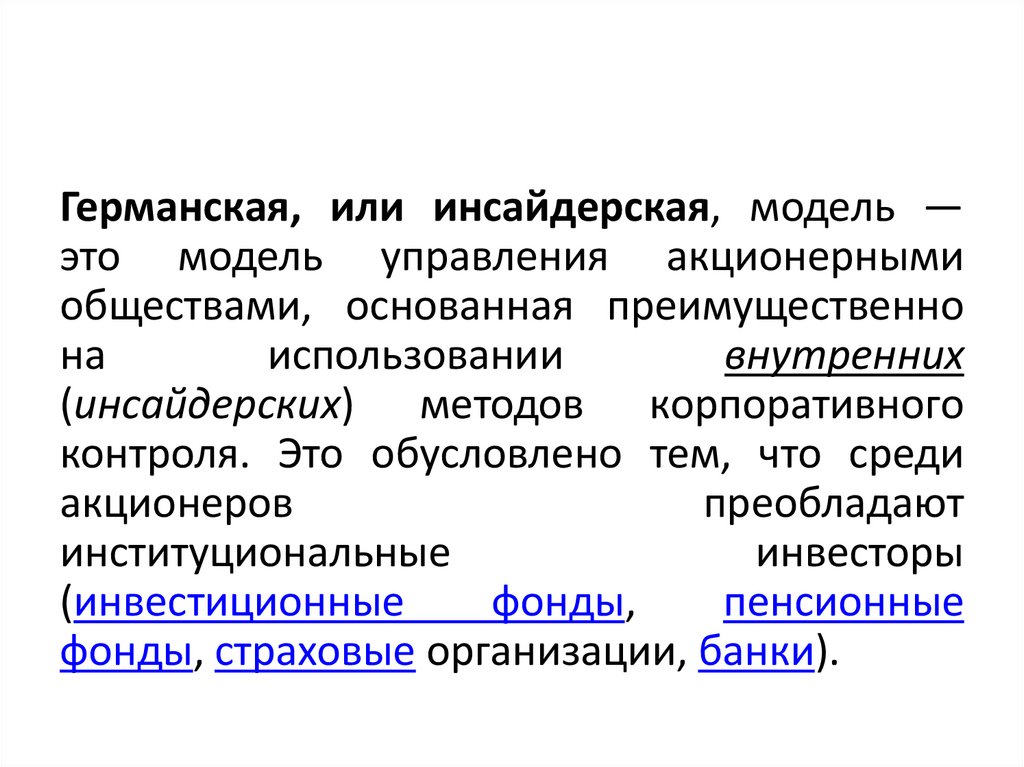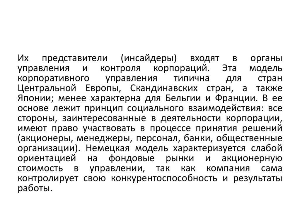 Их представители (инсайдеры) входят в органыуправления и контроля корпораций. Эта модель