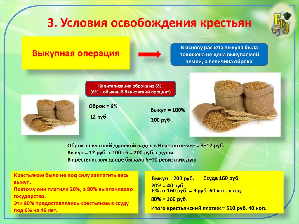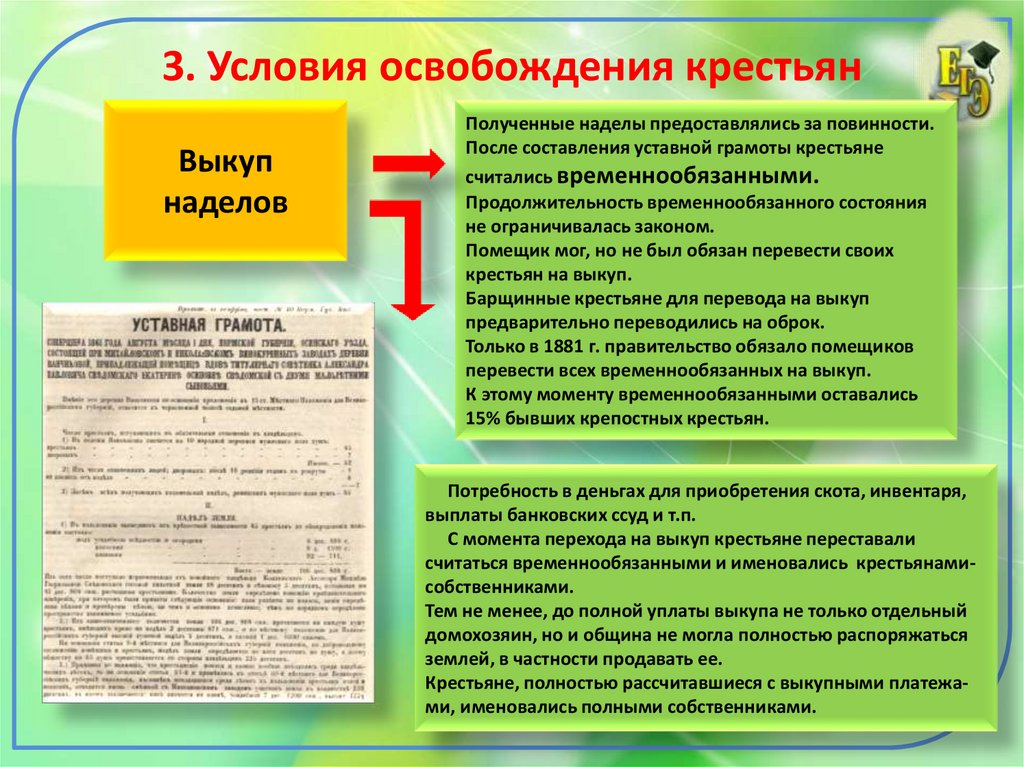 3. Условия освобождения крестьянВ основу расчета выкупа была