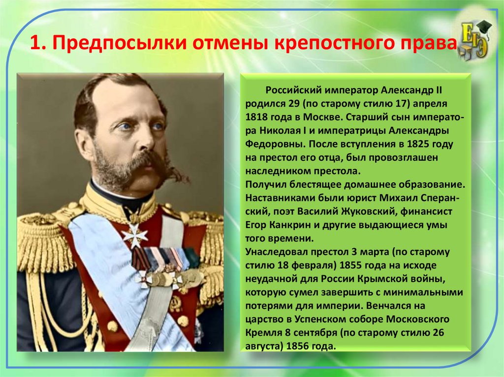 1. Предпосылки отмены крепостного праваРоссийский император Александр II