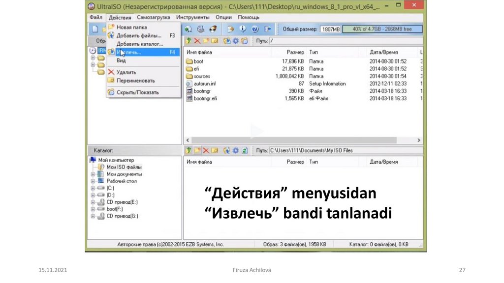 “Действия” menyusidan“Извлечь” bandi tanlanadi