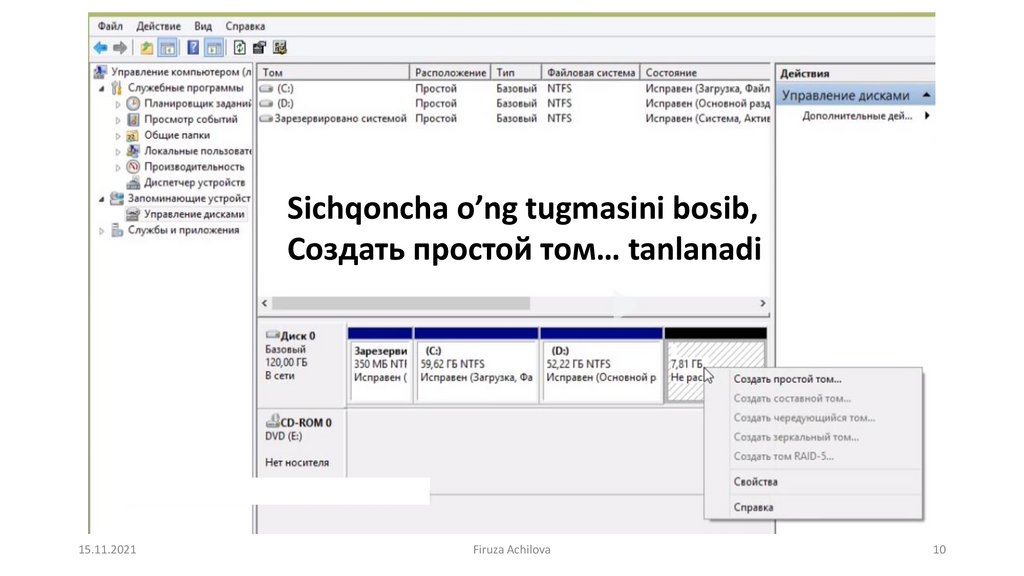 Sichqoncha o’ng tugmasini bosib,Создать простой том… tanlanadi