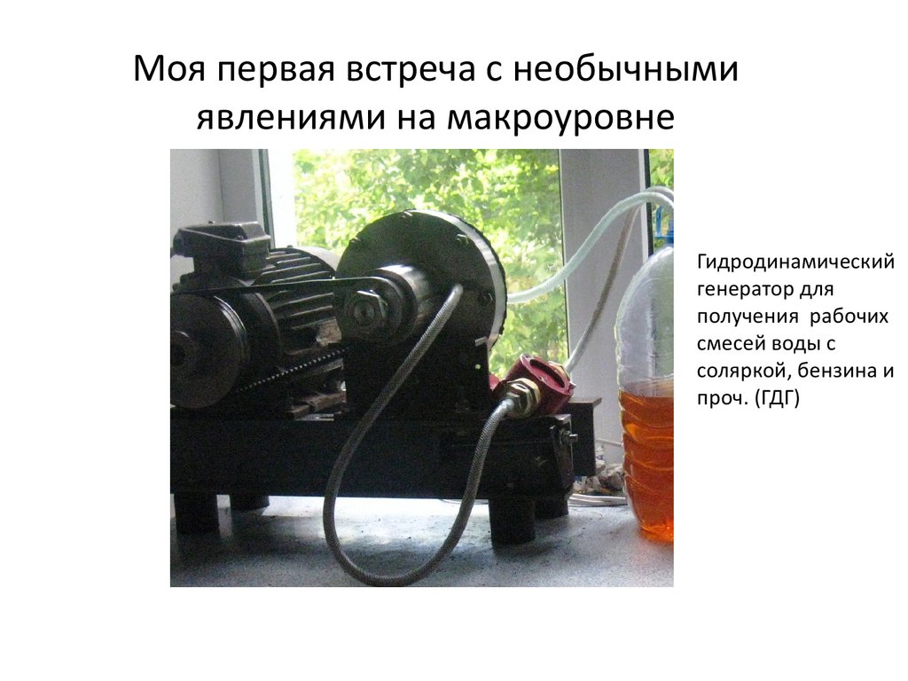 идродинамический генератор для получения рабочих смесей воды с соляркой, бензина и проч. (ГДГ)