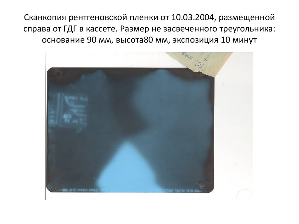 Сканкопия рентгеновской пленки от 10.03.2004, размещеннойсправа от ГДГ в кассете. Размер не засвеченного треугольника: