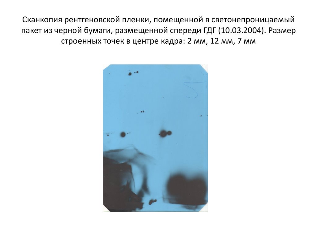 Сканкопия рентгеновской пленки, помещенной в светонепроницаемыйпакет из черной бумаги, размещенной спереди ГДГ (10.03.2004). Размер