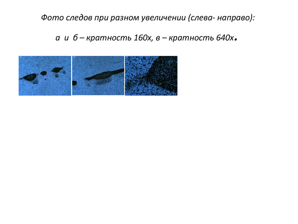 Фото следов при разном увеличении (слева- направо):а и б – кратность 160х, в – кратность 640х