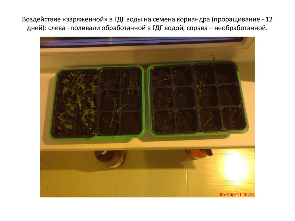 Воздействие «заряженной» в ГДГ воды на семена кориандра (проращивание - 12дней): слева –поливали обработанной в ГДГ водой, справа – необработанной.