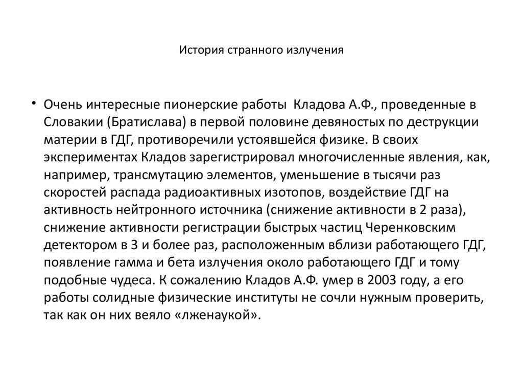 История странного излучения• Очень интересные пионерские работы Кладова А.Ф., проведенные в