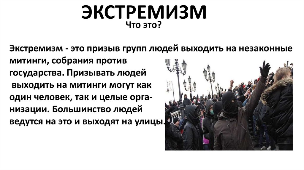 Экстремизм - это призыв групп людей выходить на незаконные