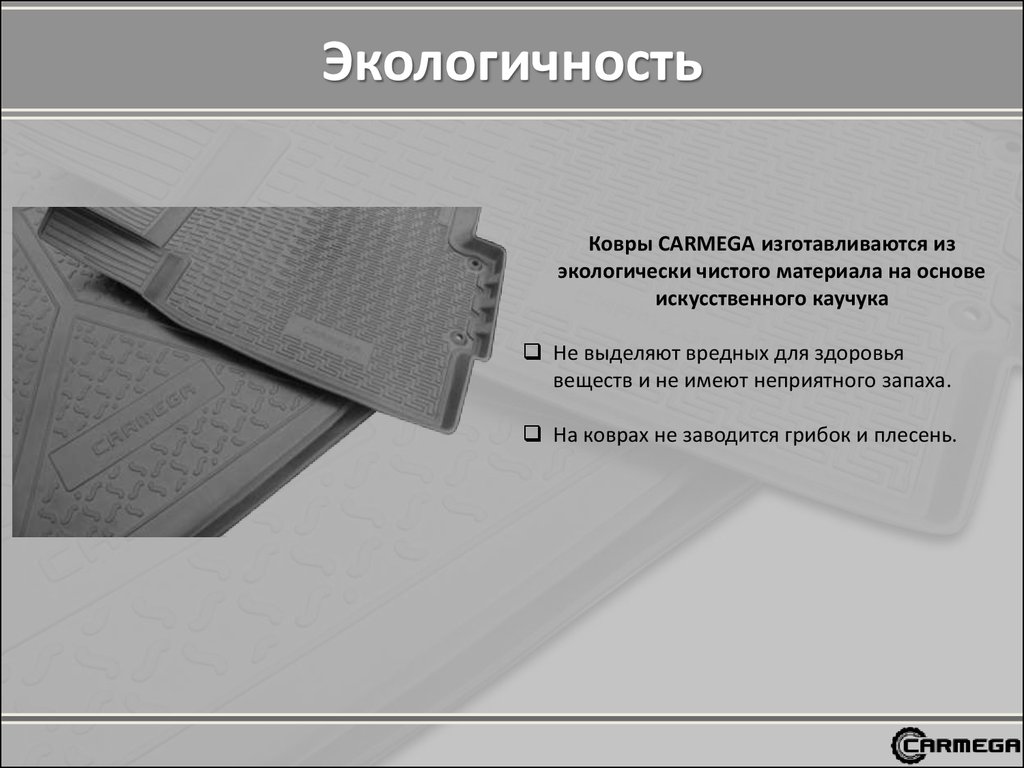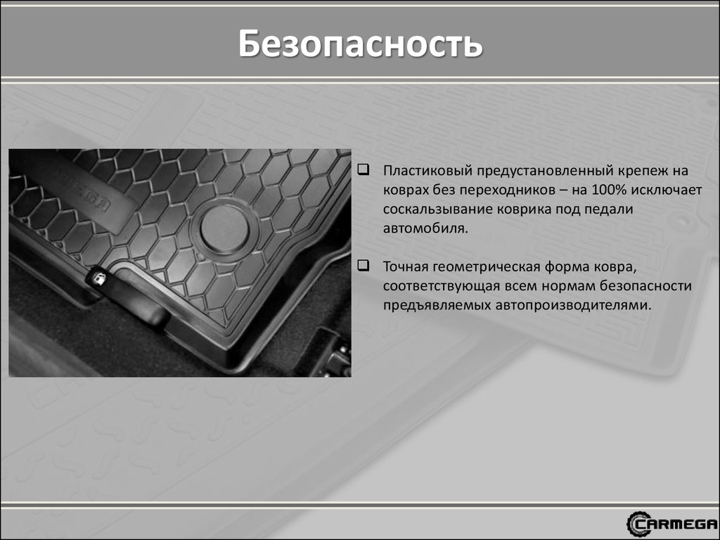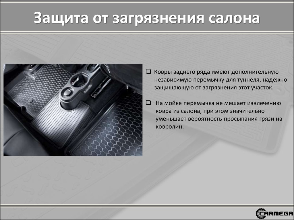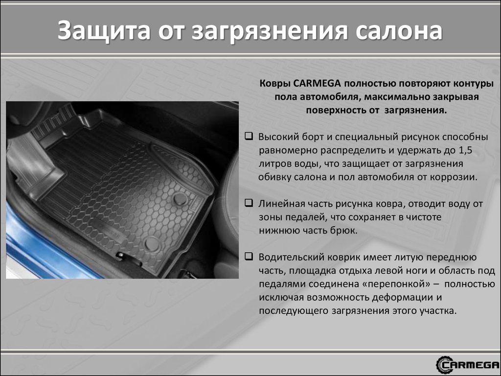 Защита от загрязнения салонаКовры CARMEGA полностью повторяют контуры