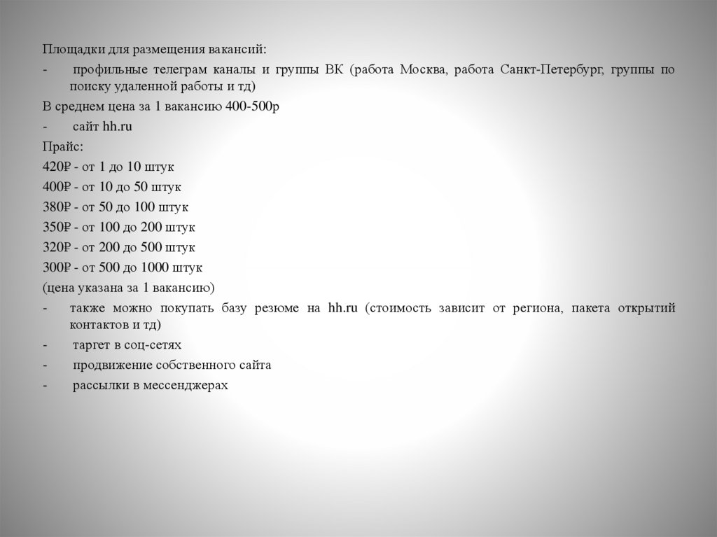 Площадки для размещения вакансий:профильные телеграм каналы и группы ВК (работа Москва, работа Санкт-Петербург, группы по
