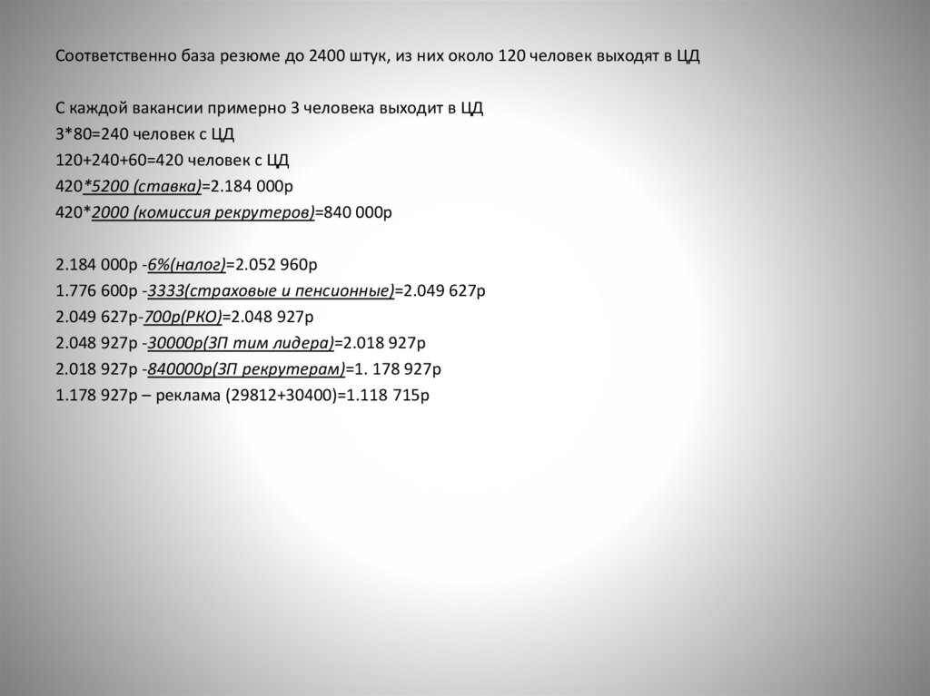 Соответственно база резюме до 2400 штук, из них около 120 человек выходят в ЦДС каждой вакансии примерно 3 человека выходит в ЦД