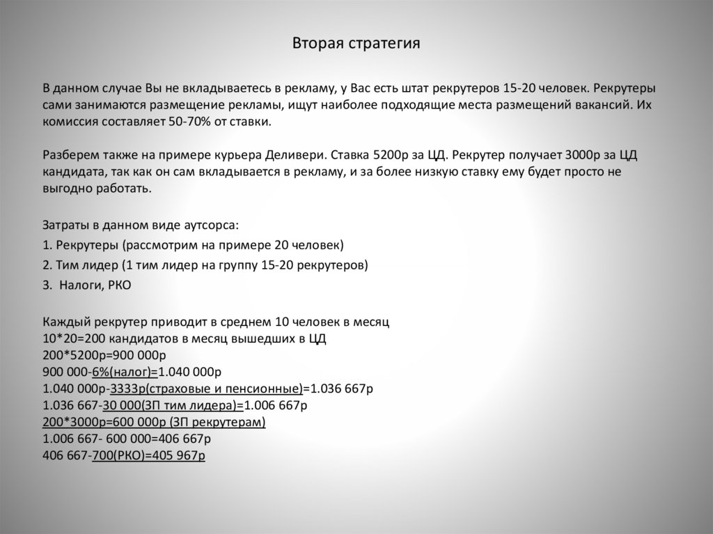 Вторая стратегияВ данном случае Вы не вкладываетесь в рекламу, у Вас есть штат рекрутеров 15-20 человек. Рекрутеры
