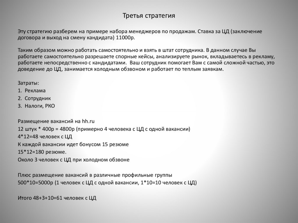 Третья стратегияЭту стратегию разберем на примере набора менеджеров по продажам. Ставка за ЦД (заключение