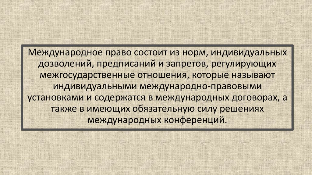 Международное право состоит из норм, индивидуальныхдозволений, предписаний и запретов, регулирующих