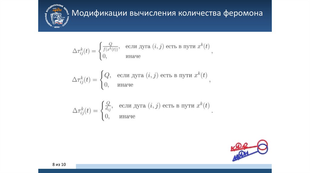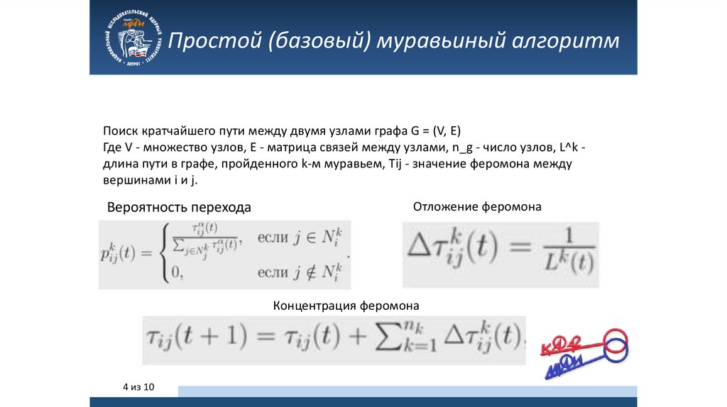 Где V - множество узлов, E - матрица связей между узлами, n_g - число узлов, L^k длина пути в графе, пройденного k-м муравьем, Tij - значение феромона между