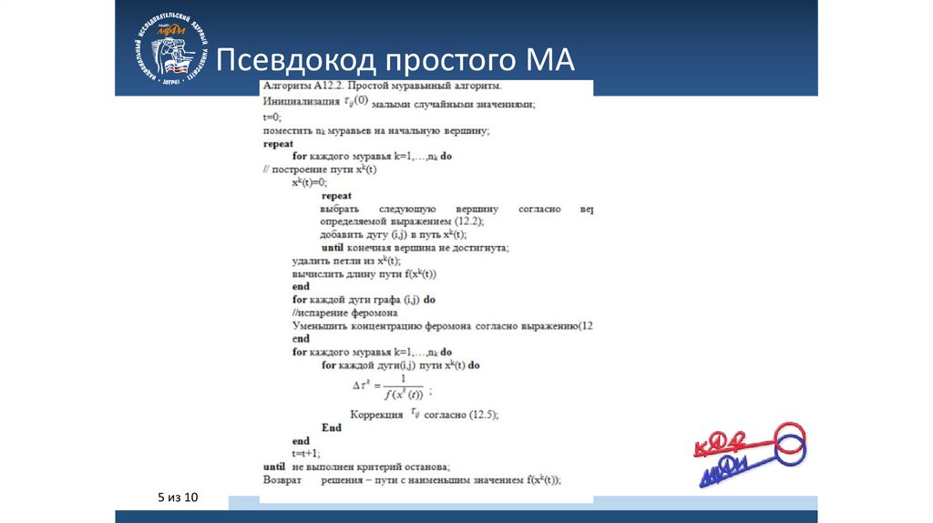 Простой (базовый) муравьиный алгоритмПоиск кратчайшего пути между двумя узлами графа G = (V, E)