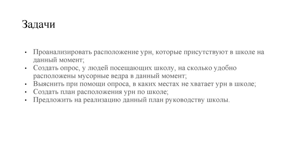 ЗадачиПроанализировать расположение урн, которые присутствуют в школе на