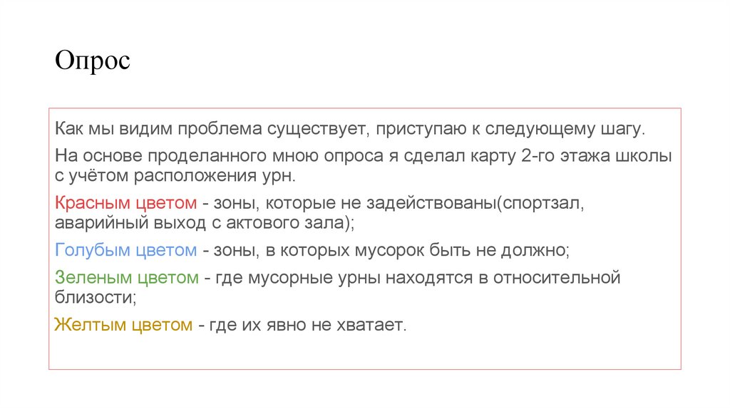 Выяснить при помощи опроса, в каких местах не хватает урн в школе;