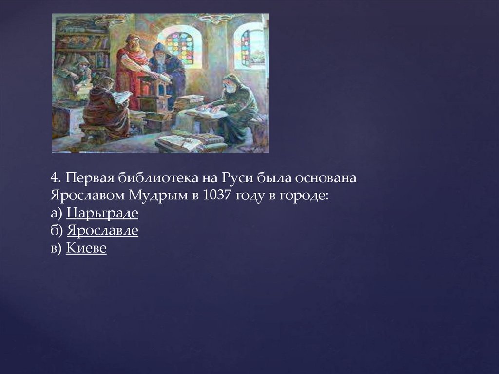 4. Первая библиотека на Руси была основанаЯрославом Мудрым в 1037 году в городе: