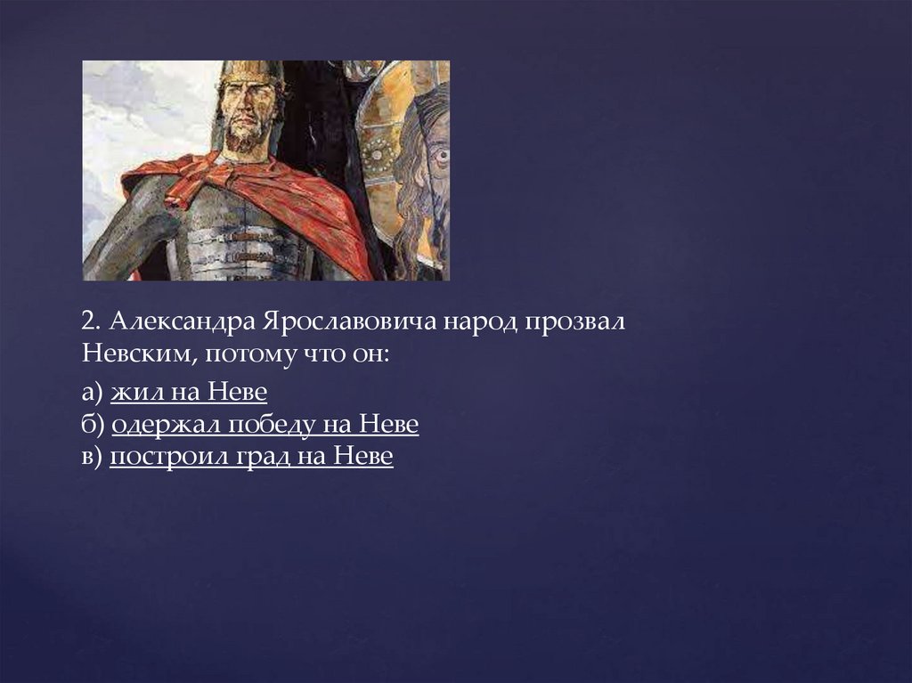 2. Александра Ярославовича народ прозвалНевским, потому что он: