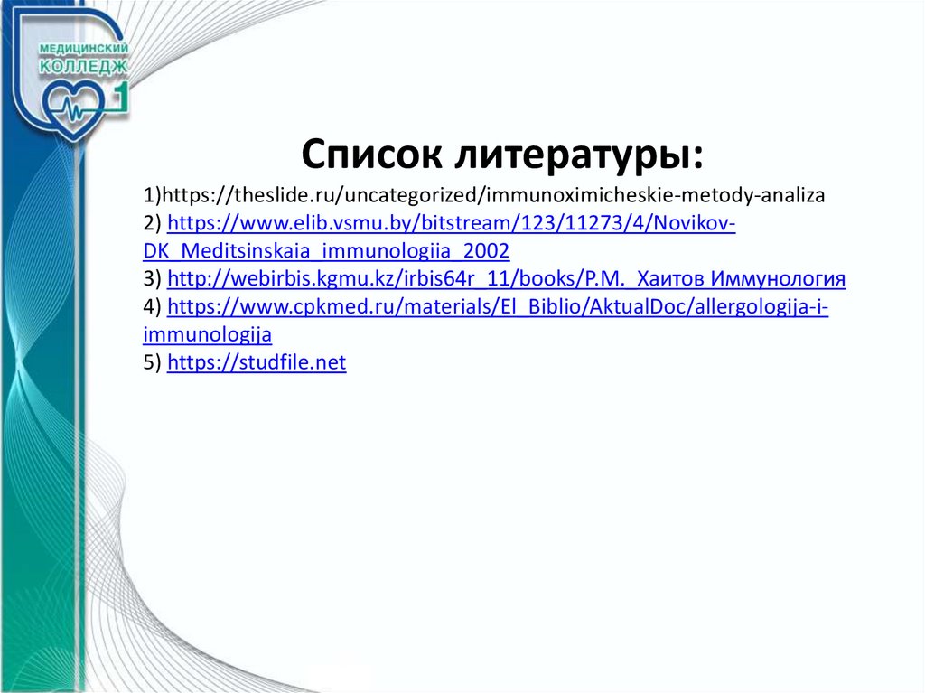Список литературы:1)https://theslide.ru/uncategorized/immunoximicheskie-metody-analiza