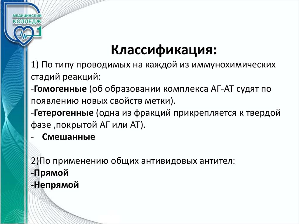 Классификация:1) По типу проводимых на каждой из иммунохимических