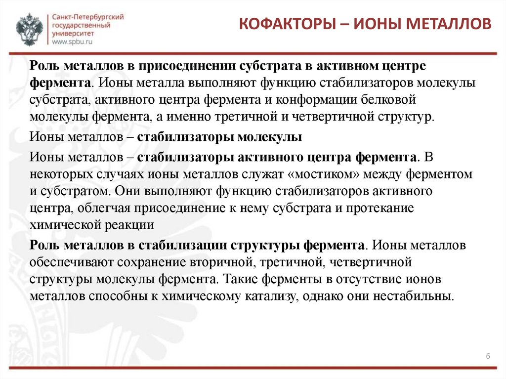 фермента. Ионы металла выполняют функцию стабилизаторов молекулы