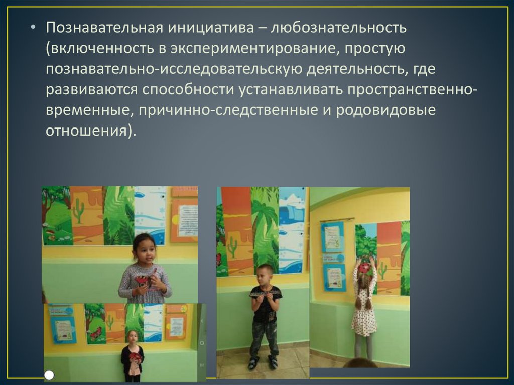 • Познавательная инициатива – любознательность(включенность в экспериментирование, простую