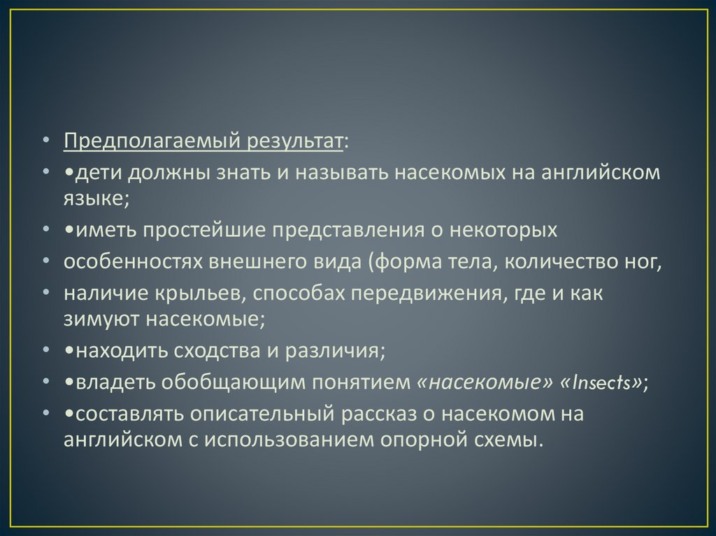 • Предполагаемый результат:• •дети должны знать и называть насекомых на английском