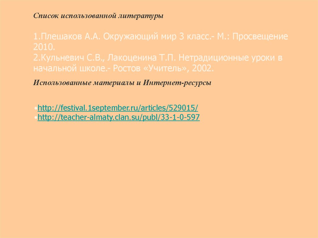 Список использованной литературы1.Плешаков А.А. Окружающий мир 3 класс.- М.: Просвещение