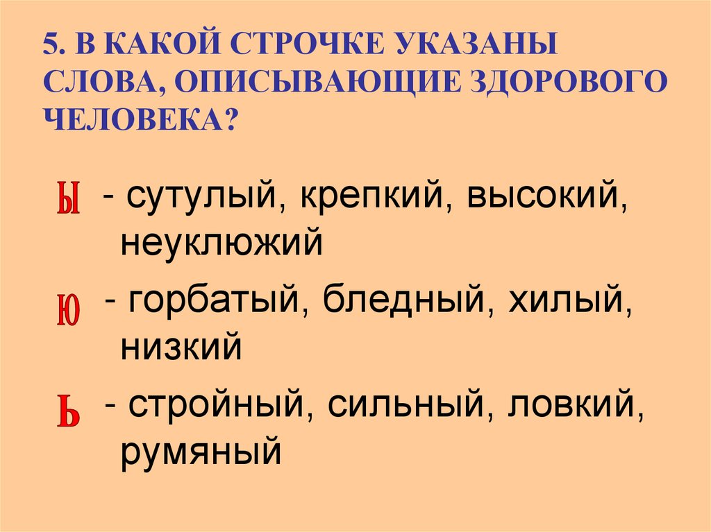 5. В КАКОЙ СТРОЧКЕ УКАЗАНЫСЛОВА, ОПИСЫВАЮЩИЕ ЗДОРОВОГО