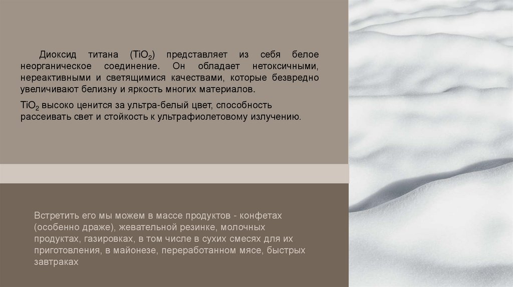 Диоксид титана (TiO2) представляет из себя белоенеорганическое соединение. Он обладает нетоксичными,
