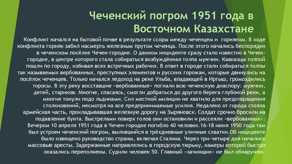 Вечером 10 апреля 1951 года в Чечен-городке погибло 40 человек.16-18 июня 1950 года там