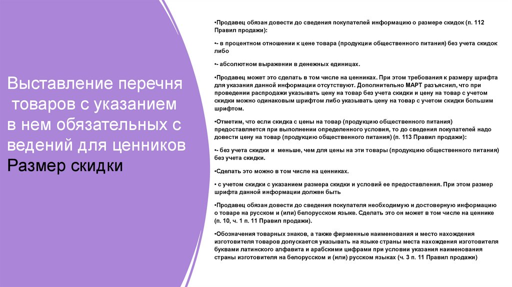 •Продавец обязан довести до сведения покупателей информацию о размере скидок (п. 112Правил продажи):