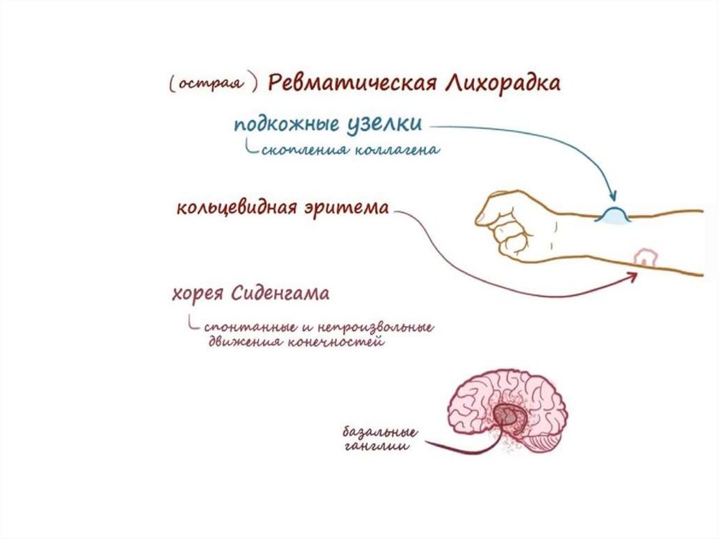 (мигрирующий полиартрит), мозге (хорея) и коже
