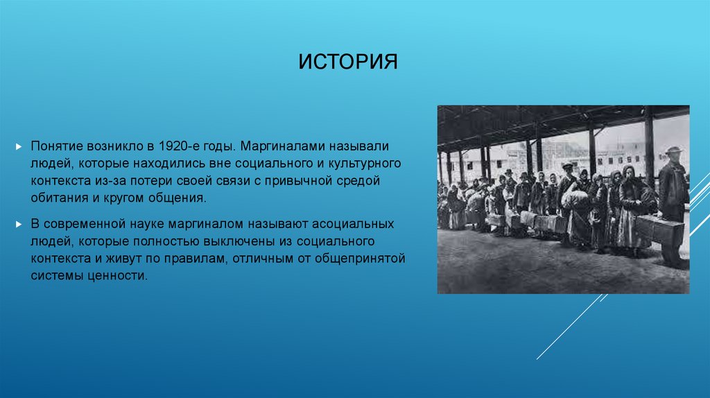 ИСТОРИЯПонятие возникло в 1920-е годы. Маргиналами называли