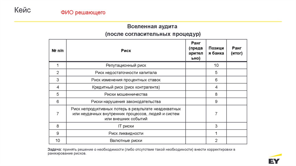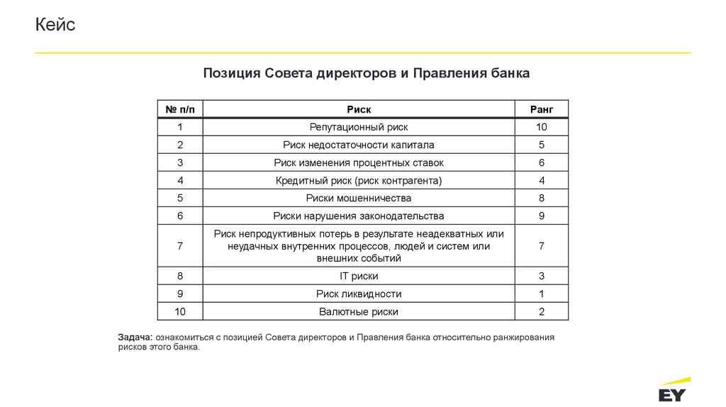 Задача: ознакомиться с позицией Совета директоров и Правления банка относительно ранжирования