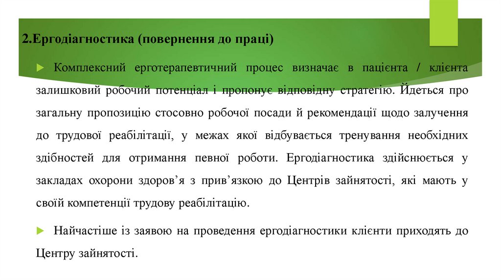 трудову реабілітацію та тренувати певні види заняттєвої активності для того, щоб у майбутньому