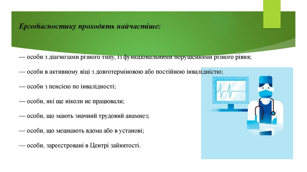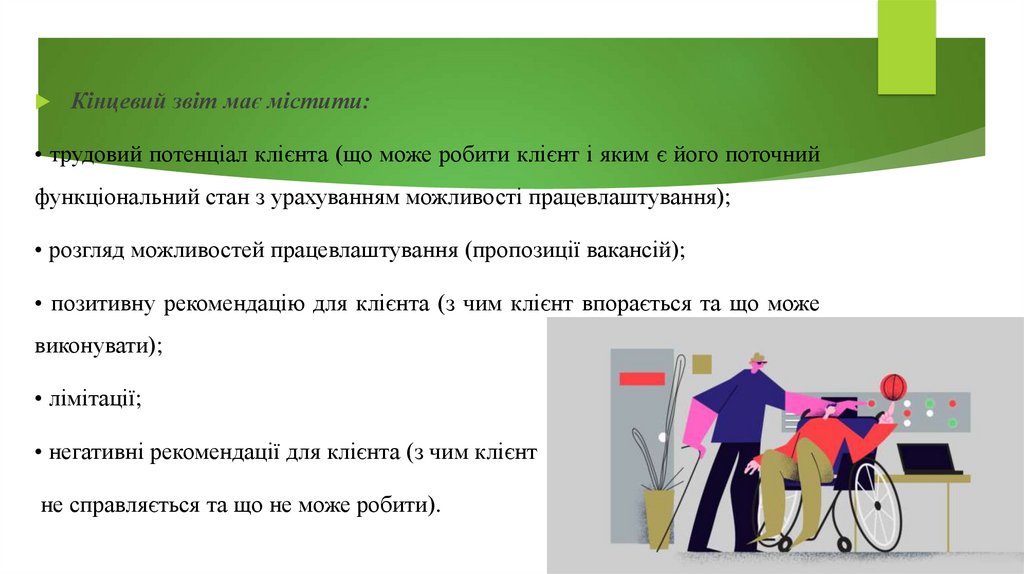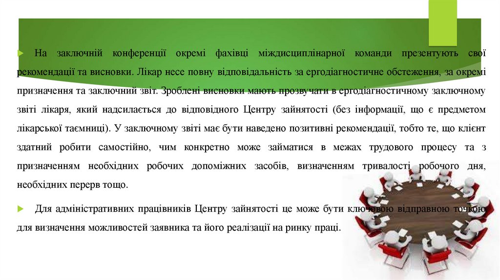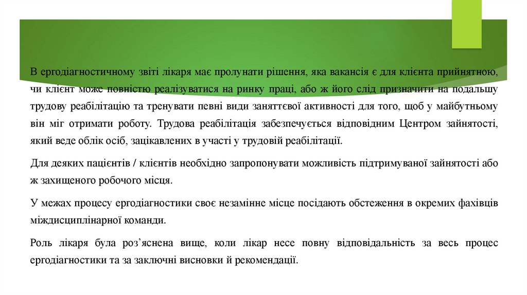 В ергодіагностичному звіті лікаря має пролунати рішення, яка вакансія є для клієнта прийнятною,чи клієнт може повністю реалізуватися на ринку праці, або ж його слід призначити на подальшу
