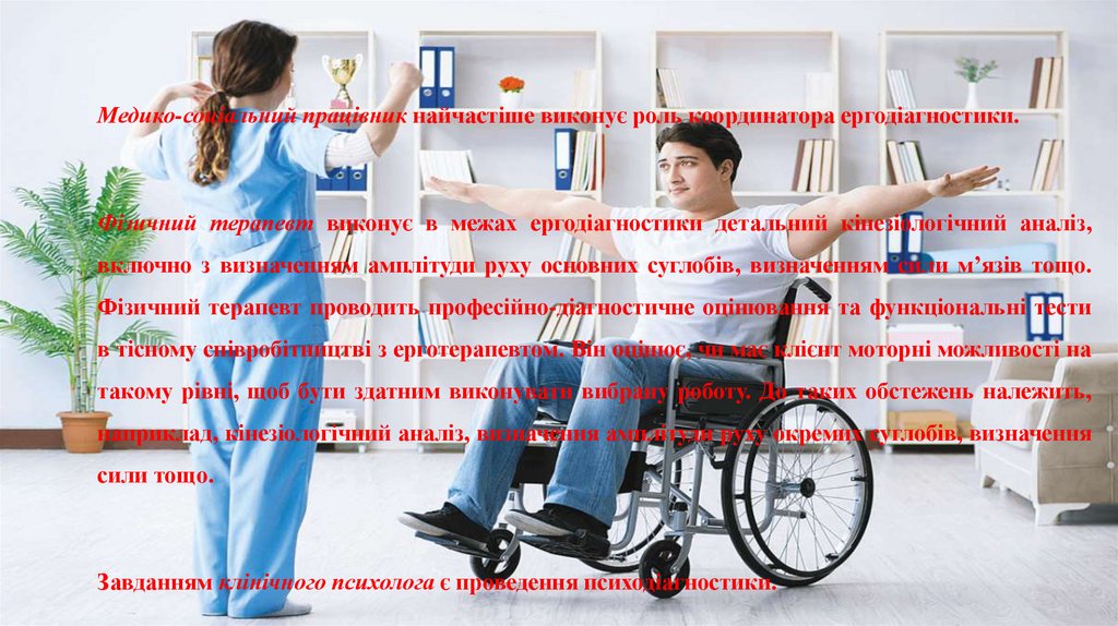 Медико-соціальний працівник найчастіше виконує роль координатора ергодіагностики.Фізичний терапевт виконує в межах ергодіагностики детальний кінезіологічний аналіз,
