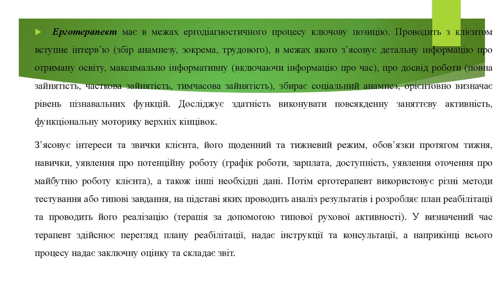 Ерготерапевт має в межах ергодіагностичного процесу ключову позицію. Проводить з клієнтомвступне інтерв’ю (збір анамнезу, зокрема, трудового), в межах якого з’ясовує детальну інформацію про