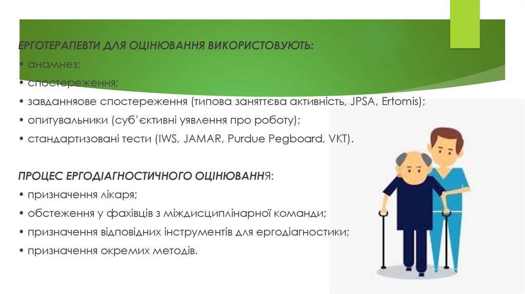 ЕРГОТЕРАПЕВТИ ДЛЯ ОЦІНЮВАННЯ ВИКОРИСТОВУЮТЬ:• анамнез;