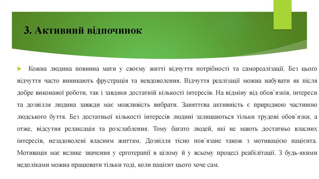 інтересів, незадоволені власним життям. Дозвілля тісно пов’язане також з мотивацією пацієнта.