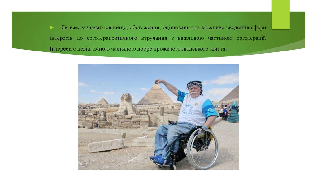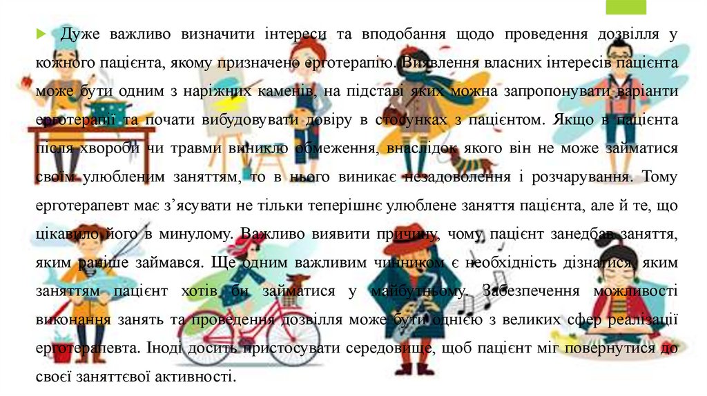 ерготерапевт має з’ясувати не тільки теперішнє улюблене заняття пацієнта, але й те, що