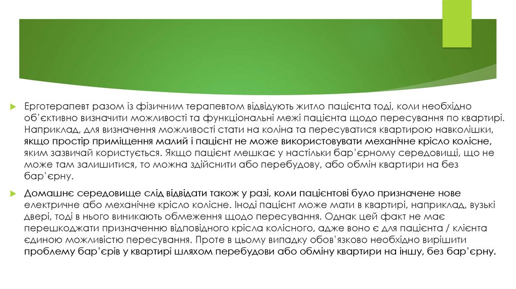 Ерготерапевт разом із фізичним терапевтом відвідують житло пацієнта тоді, коли необхіднооб’єктивно визначити можливості та функціональні межі пацієнта щодо пересування по квартирі.