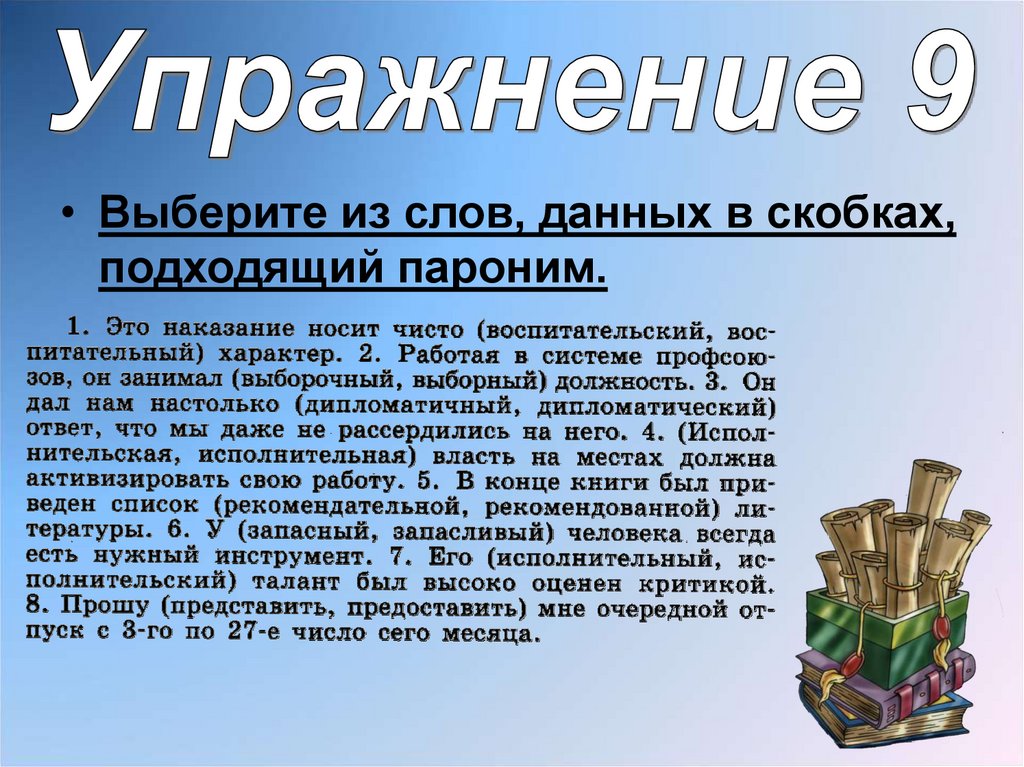 • Выберите из слов, данных в скобках,подходящий пароним.